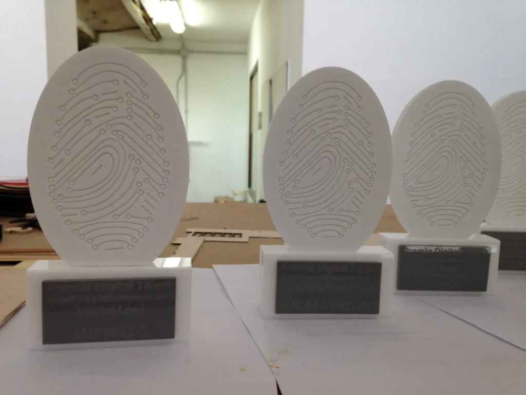 En este trabajo, tanto el diseño cómo la postproducción fueron hechas totalmente a medida sobre la idea del cliente. Primero, hicimos un diseño en 2D con una propuesta, que posteriormente se grabaría con la fresadora. El diseño de la huella dactilar quedaría grabado en relieve, obteniendo un trofeo original, llamativo y de buena calidad. El premio además debía llevar una inscripción en su base, la cual fue grabada con láser sobre una pieza de metacrilato.