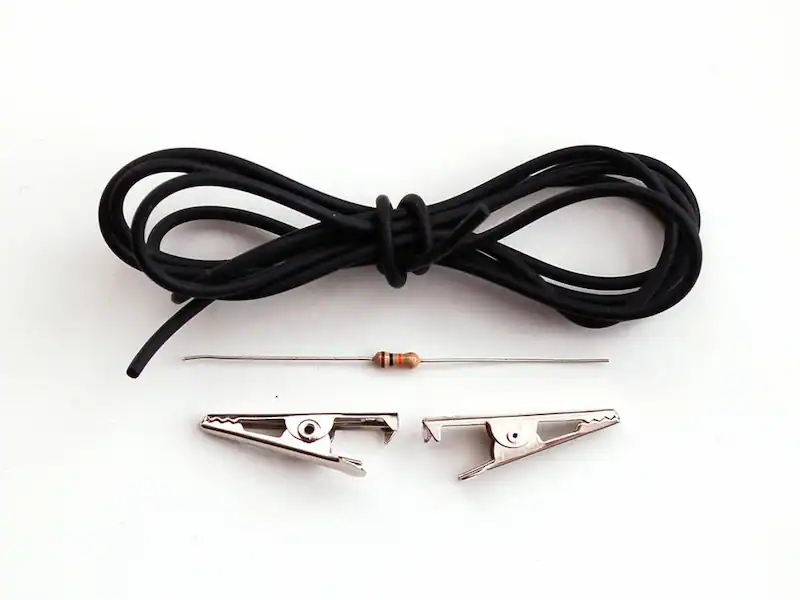 Con este material se incluye un medidor completo y dos pinzas de cocodrilo (para conectar al cable), además de una resistencia de 10K. Juntos, pueden usarlos para hacer un divisor de voltaje simple. Puede usar este práctico tutorial de termistor para medir el voltaje analógico y convertirlo nuevamente en resistencia.