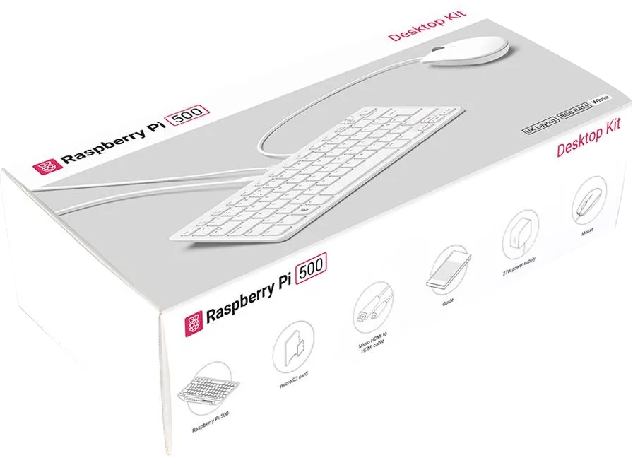 Raspberry Pi 500 Kit es un teclado con ordenador Raspberry Pi integrado, fuente de alimentación oficial, ratón, tarjeta microSD con sistema operativo y accesorios. Ideal para educación, programación e IoT.